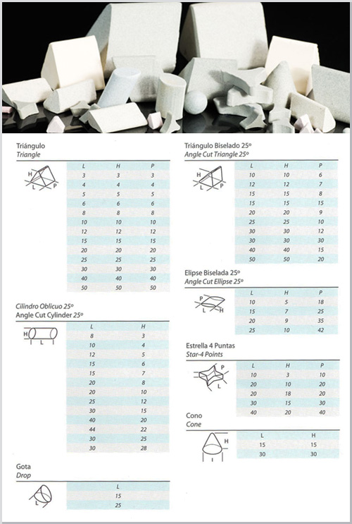 Chips abrasivos cerámicos para el acabado en máquinas vibrantes de todo tipo de piezas metálicas. También apropiados para mármol y piedras duras.