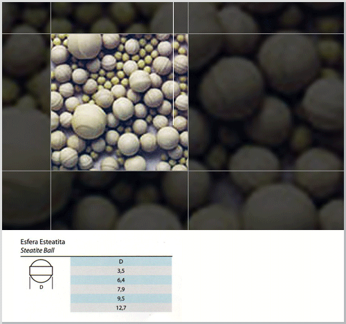 Esferas de esteatita de dimensiones calibradas apropiadas para el acabado de piezas con agujeros especiales. Grado de consumo muy bajo.